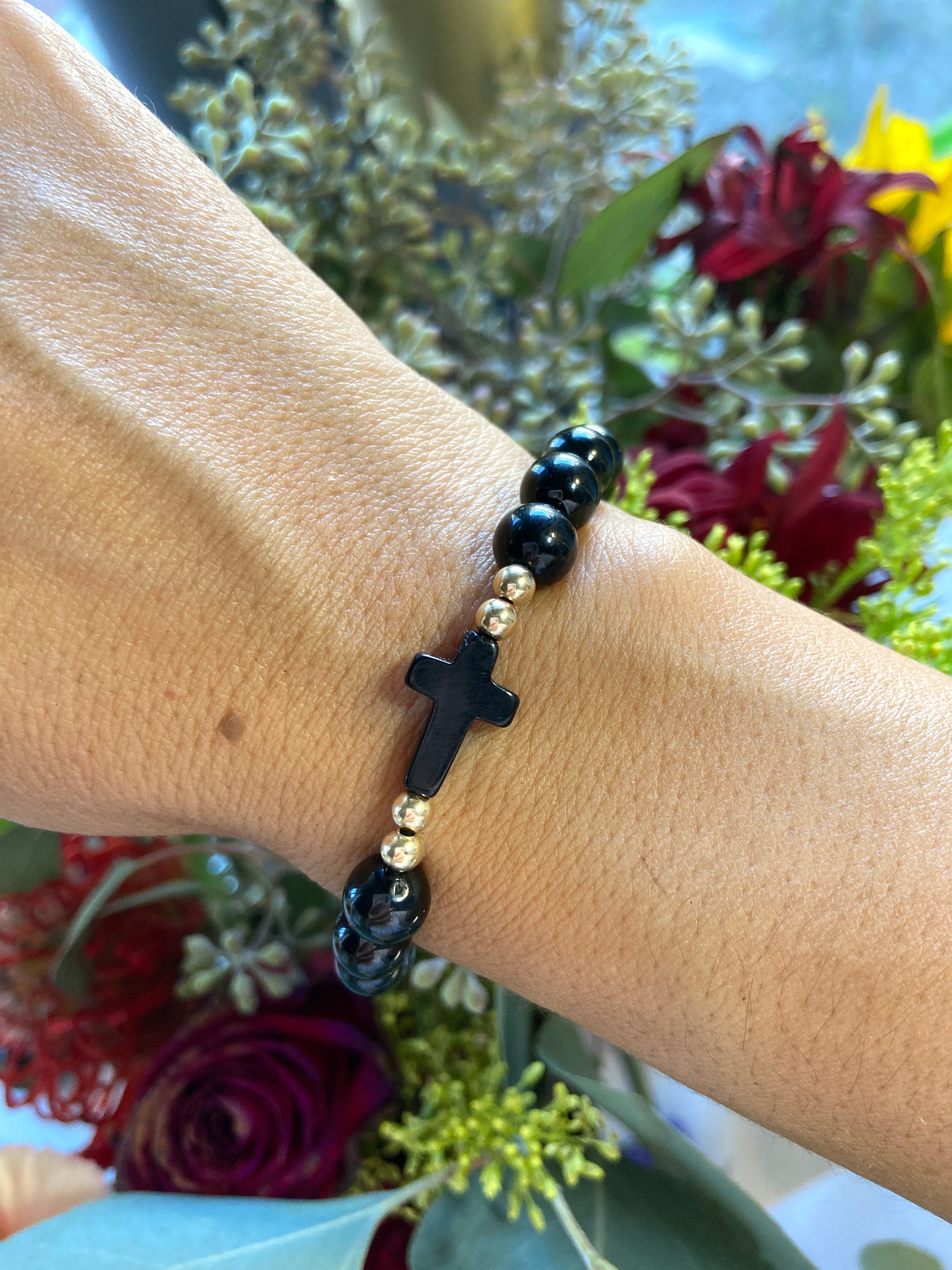 8mm bead w/ Black Onyx cross and 14k gold filled beads.